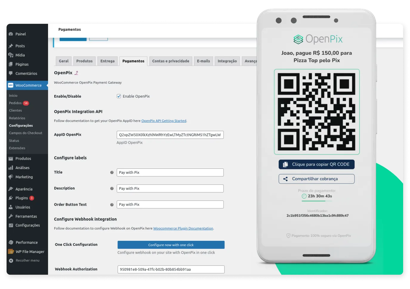 A integração é simples e rápida, basta instalar o plugin da Woovi no seu Wordpress. Ele é compatível com o Woocommerce e com o Woocommerce Subscription, facilitando a aceitação de pagamentos via Pix diretamente na sua loja online.